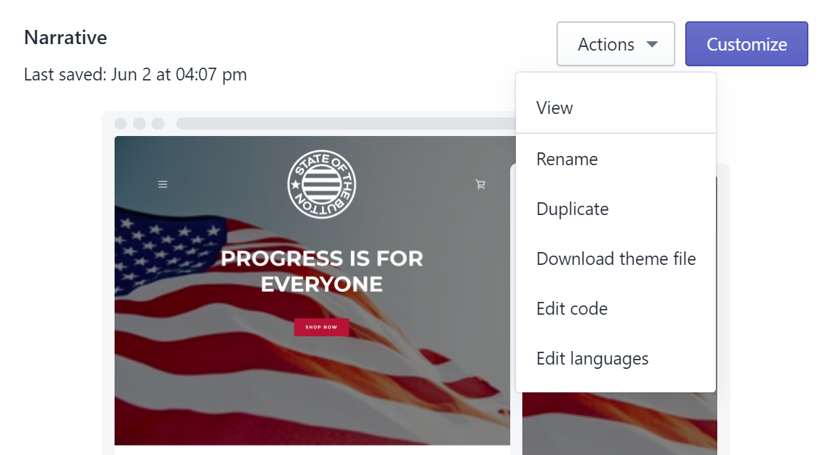 Shopify also has a theme export feature. Your theme file really only needs backed up if you made changes to the theme itself. Otherwise, backing up the content is all you need to do. To export your theme, click Online Store in the left sidebar beneath SALES CHANNELS. This takes you to the Themes page which shows your current theme and any other themes you’ve used or saved. Once there, click the Actions button then Download theme file.