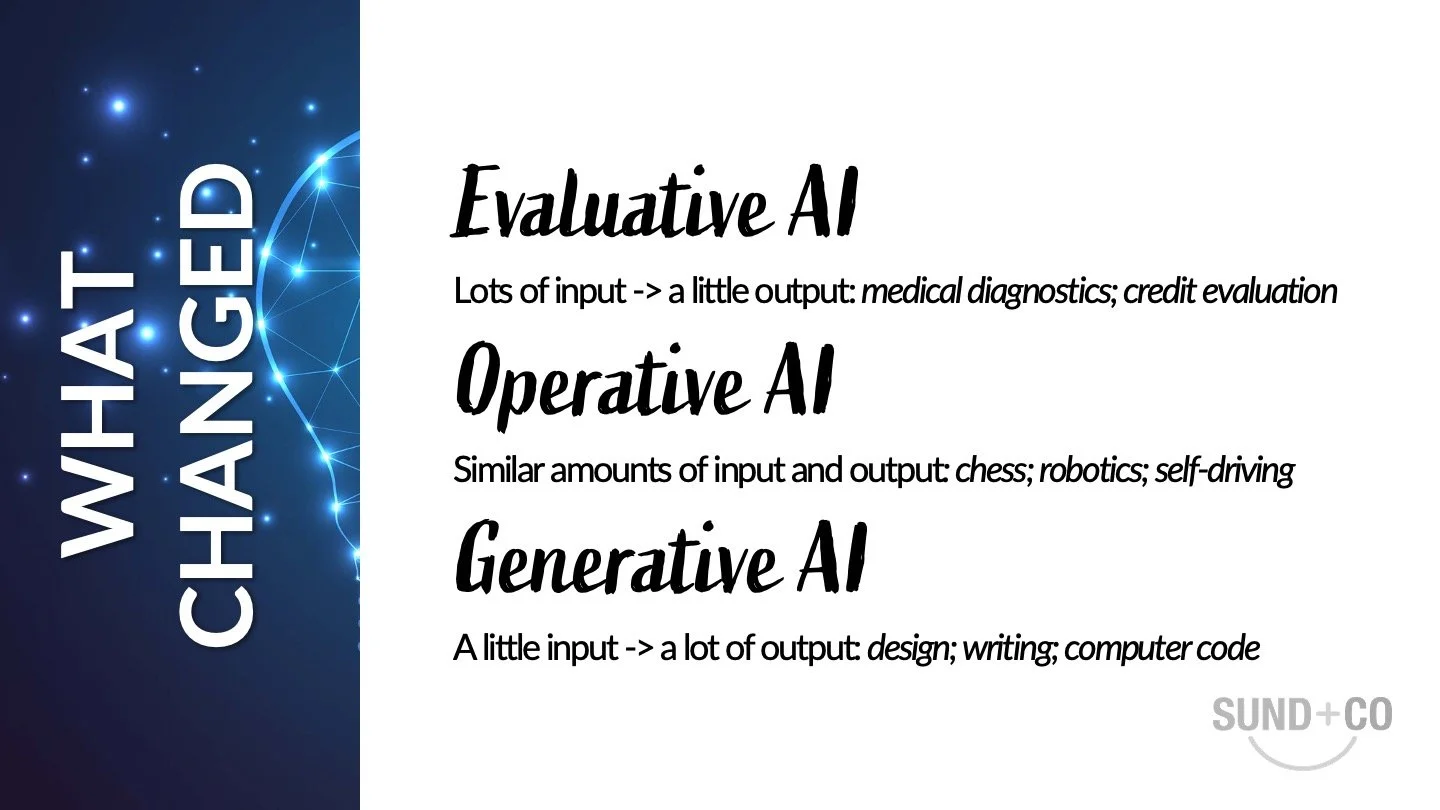 Evaluative AI was the first to arrive: it needs a lot of input to come up with one output: a medical diagnosis, credit evaluation, etc.