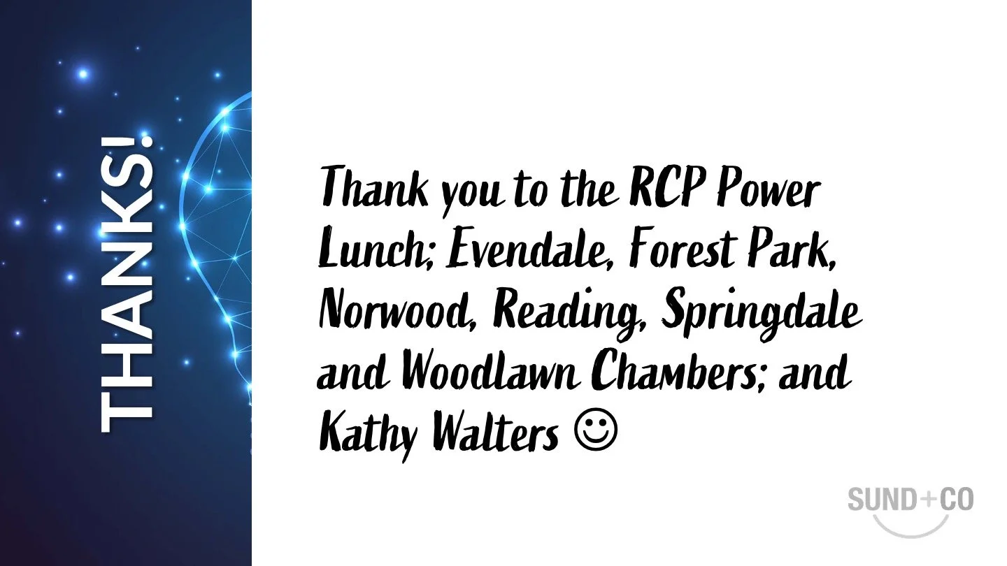 To the RCP Power Lunch; the Evendale, Forest Park, Norwood, Reading, Springdale, and Woodlawn Chambers of Commerce; and Kathy Walters :-)